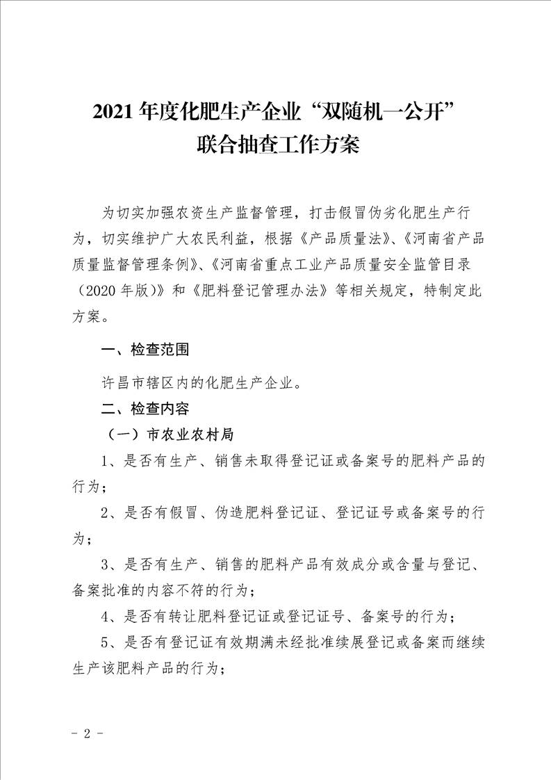 许昌市365bet线上平台_365bet指数_365正规官网农村局 许昌市市场监督管理局关于印发《2021年度化肥生产企业“双随机一公开”联合抽查工作方案》的通知